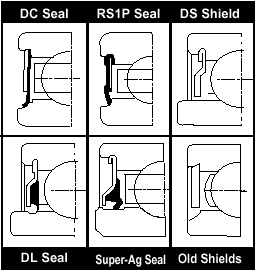 The NICE® RS1P seal, which is standard on the 1600, 3000, and 6900 series bearings, is made of oil and wear resistant synthetic rubber with a steel reinforcement. The sealing action is accomplished via interference (deflection) of the seal lip against a recess in the inner ring shoulder. The outside diameter of the seal is retained in a recess groove cut into the outer ring. The DC seal is an old style multi-part assembly consisting of a nylon seal insert held in place with a metal shield. It is a cost effective seal used only on a few sizes and specials. The NICE® DL and Super Ag seals are special high efficiency contact seals for heavy duty applications. They are constructed of synthetic rubber molded to the back of a metal shroud or guard. The seal lip rides in a labyrinth groove for reduced seal drag and lower torque against the inner ring land surface.