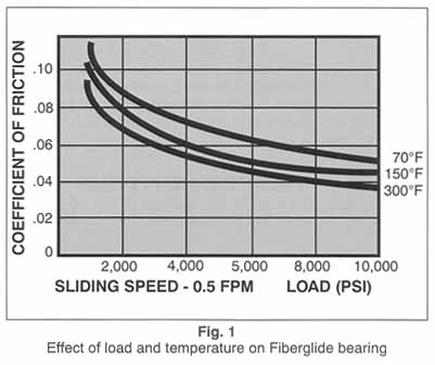 Coefficient of friction depends upon type of movement, finish of mating surface, ambient temperature, bearing pressure, velocity and other variables. Figs. 1,2, and 3 were obtained from flat specimens and may be used as a guide. Note in Fig. 1 that the coefficient drops off as bearing load increases. This offers the advantage of using the smallest bearing sizes to obtain the least amount of friction. Fig. 3 shows the coefficient of friction increasing as surface velocity increases from 2-20 FPM. This feature is particularly valuable for vehicle steering systems.