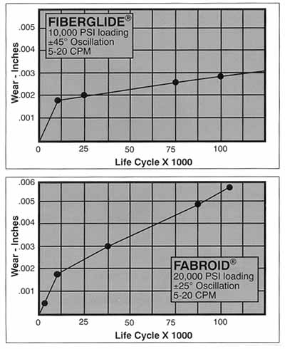 The graphs below are typical wear curves for two types of self-lubricating liner materials; Standard FIBERGLIDE® A, and FABROID® G. The standard FIBERGLIDE® A material is suitable for most applications and significantly outperforms other bearing types. But, should your application include extraordinarily high static and/or dynamic loads, extremes of temperature, or chemical resistance requirements, Transport Dynamics manufactures a variety of liner materials and backing for critical service applications. There are two types of FIBERGLIDE® liners depending on the product configuration and three types of FABROID®.