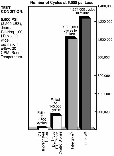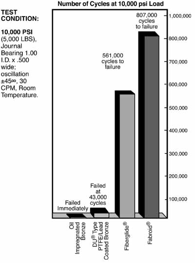 The bearings were placed under a fixed load with an oscillating shaft. The test bearing size was 1.00 inch I.D. by .500 inches long. The test conditions were 10,000 psi (5,000 lbs.) and 5,000 psi (2,500 lbs.) loads with an oscillation of +/- 45 degrees and 30 cycles peer minute at room temperature. Approximately every 10,000 cycles, the bearings were removed and inspected for wear.